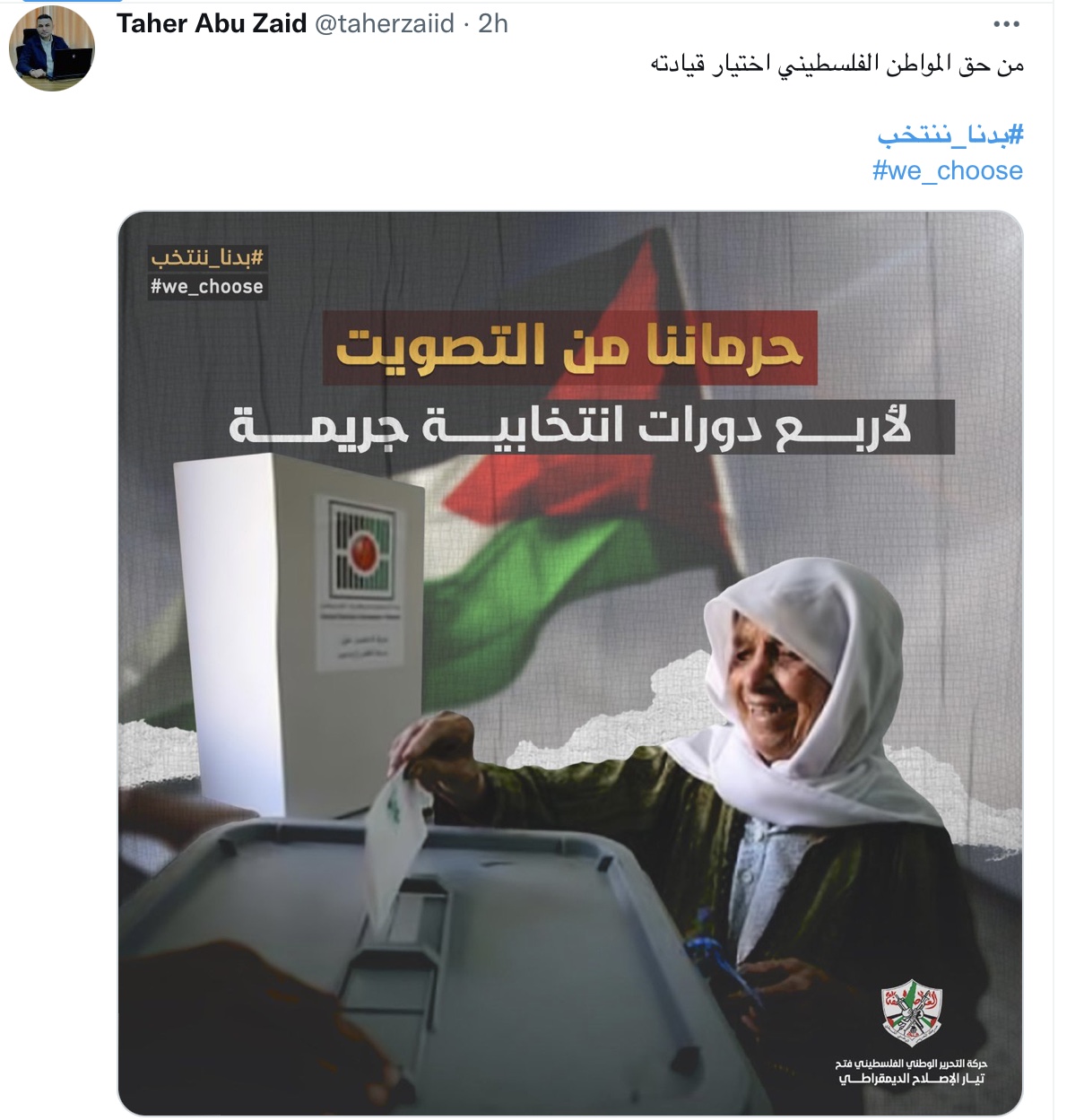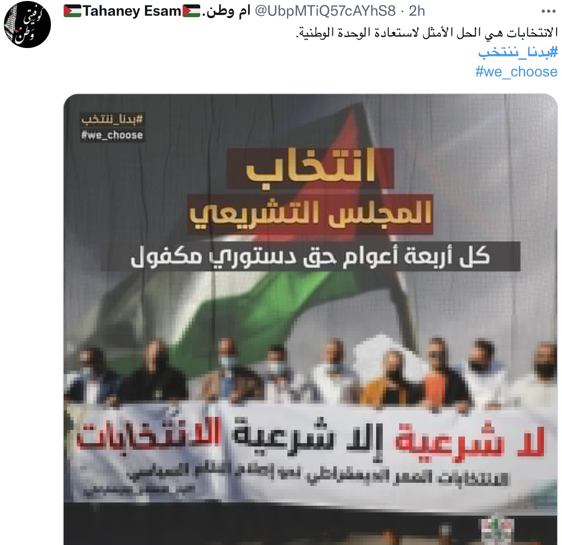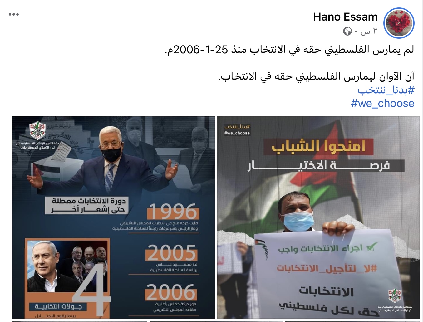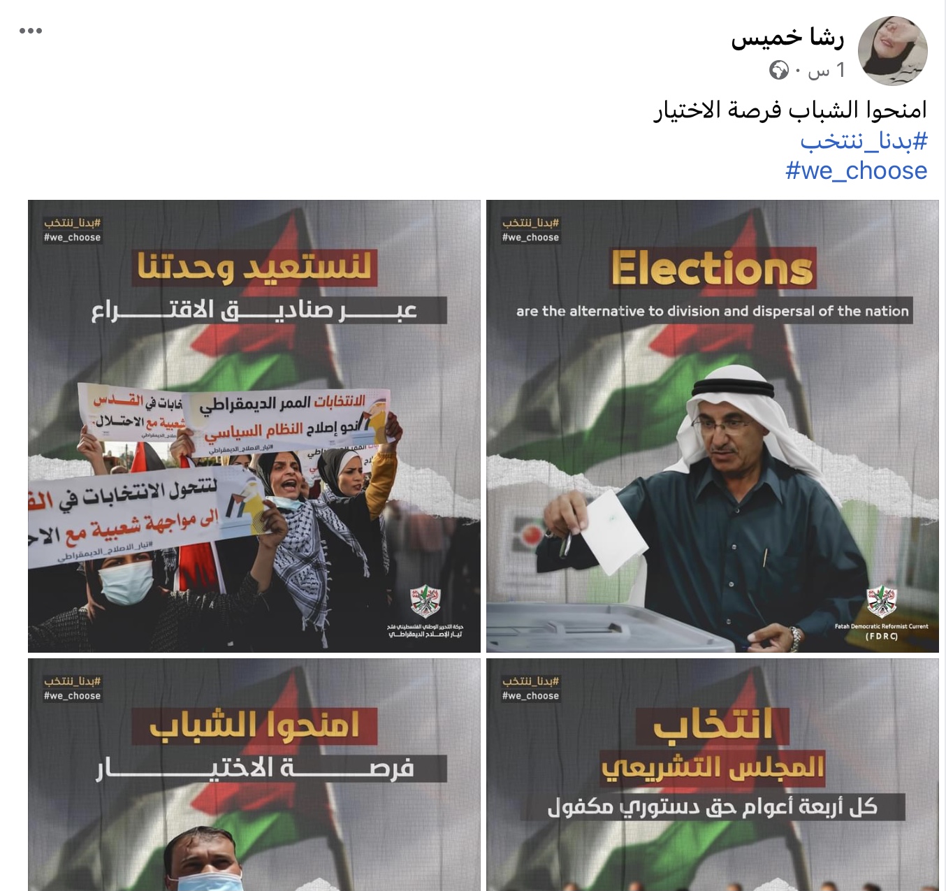 وتضمنت المشاركات “صور ومقاطع فيديو وعبارات” تدعو لإجراء الانتخابات الفلسطينية العامة، من أجل بناء نظام سياسي جديد يُلبي طموحات شعبنا، لاسيما فئة الشباب التي تُعاني ويلات الانقسام.