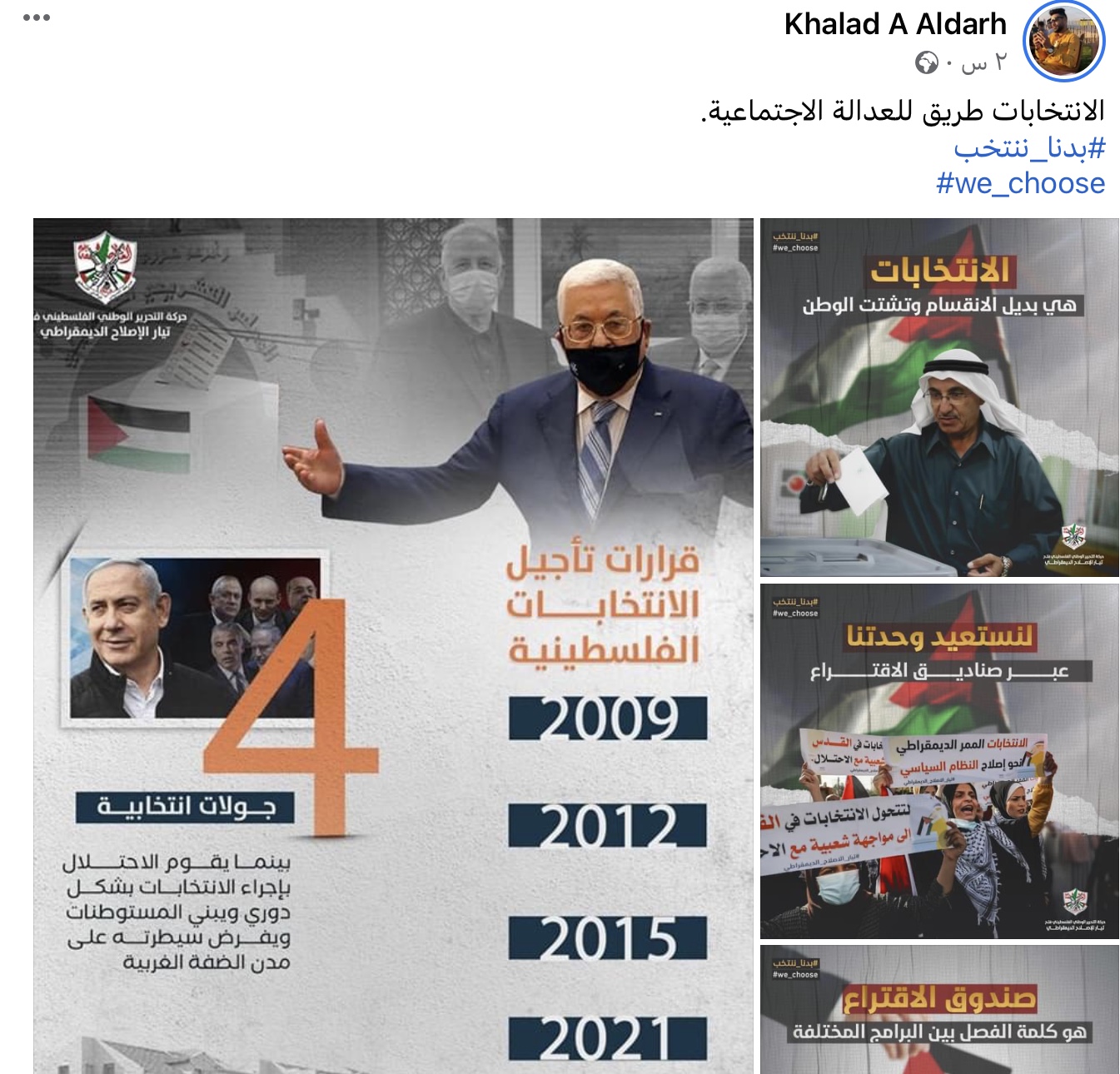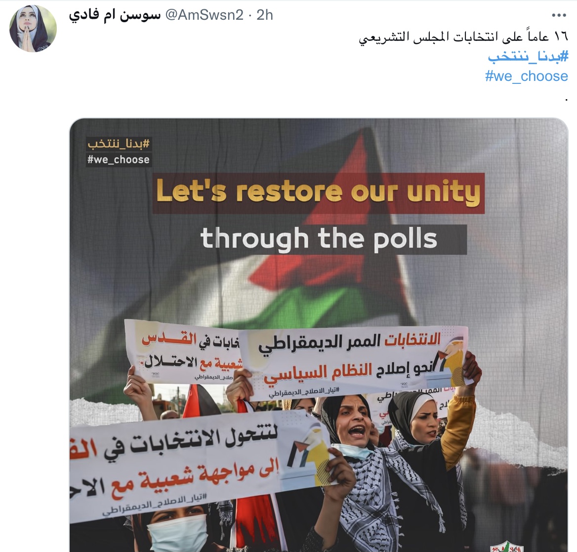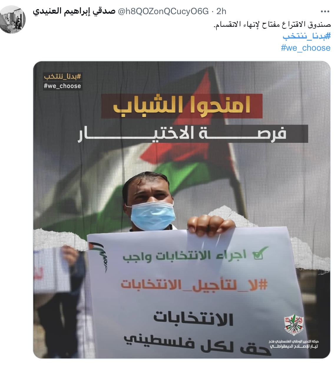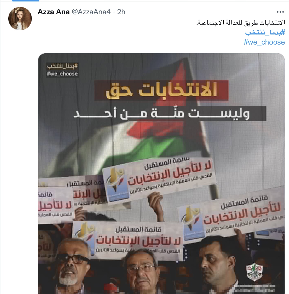 وتضمنت المشاركات “صور ومقاطع فيديو وعبارات” تدعو لإجراء الانتخابات الفلسطينية العامة، من أجل بناء نظام سياسي جديد يُلبي طموحات شعبنا، لاسيما فئة الشباب التي تُعاني ويلات الانقسام.