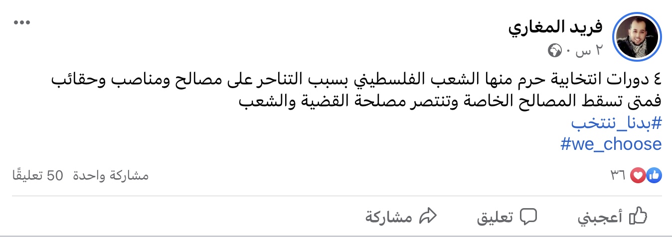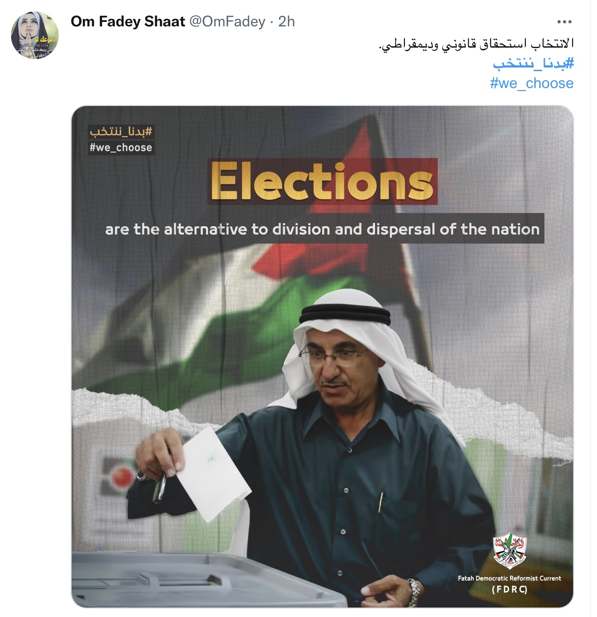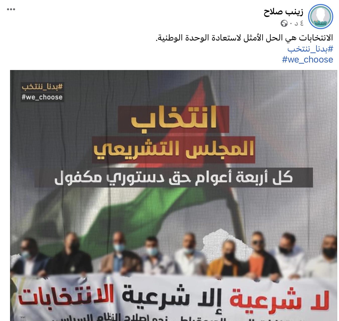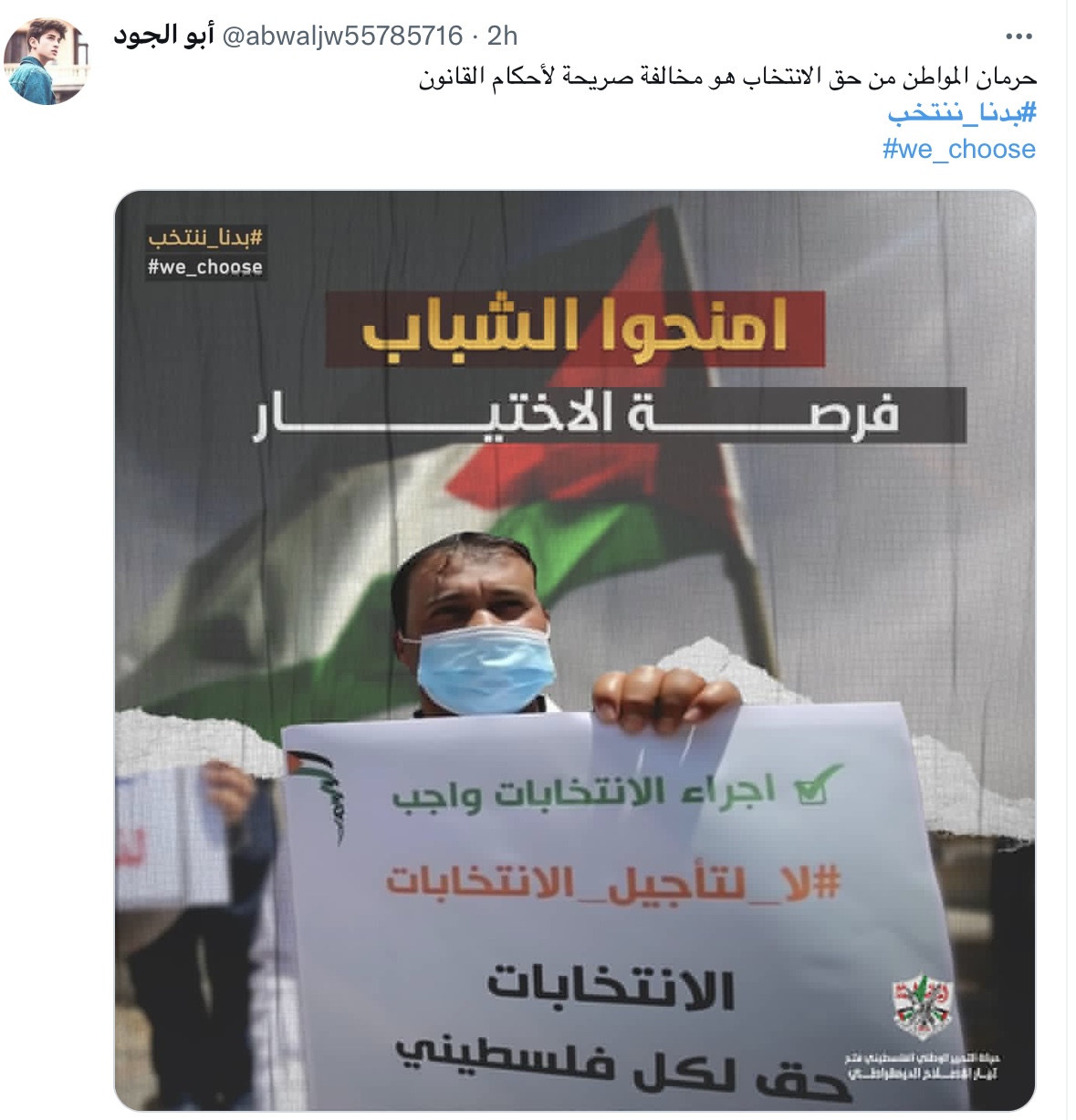 وتضمنت المشاركات “صور ومقاطع فيديو وعبارات” تدعو لإجراء الانتخابات الفلسطينية العامة، من أجل بناء نظام سياسي جديد يُلبي طموحات شعبنا، لاسيما فئة الشباب التي تُعاني ويلات الانقسام.