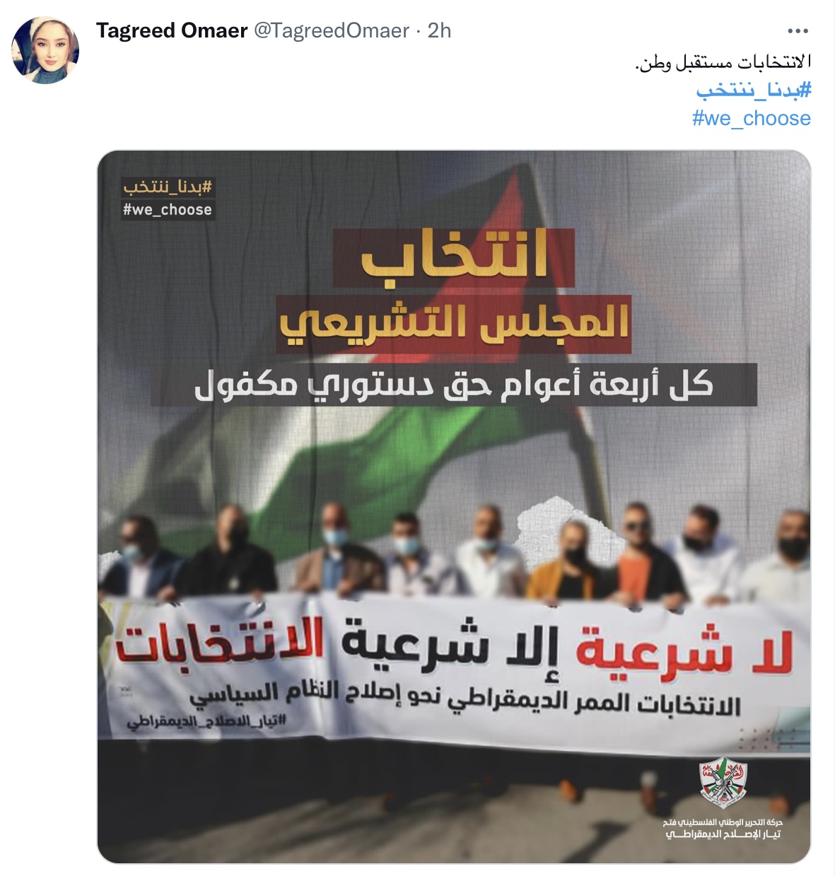 وتصدّر وسم (#بدنا_ننتخب)، الذي أطلق عبره التيار حملته الإلكترونية، قائمة الوسوم المتداولة في فلسطين، فحقق انتشاراً واسعاً بتغريدات وتدوينات مختلفة طالبت بالإسراع وتذليل العقبات من أجل العودة إلى صناديق الاقتراع وإتاحة الفرصة للأجيال الجديدة لانتخاب من يمثلها ويعبر عن همومها وأحلامها.