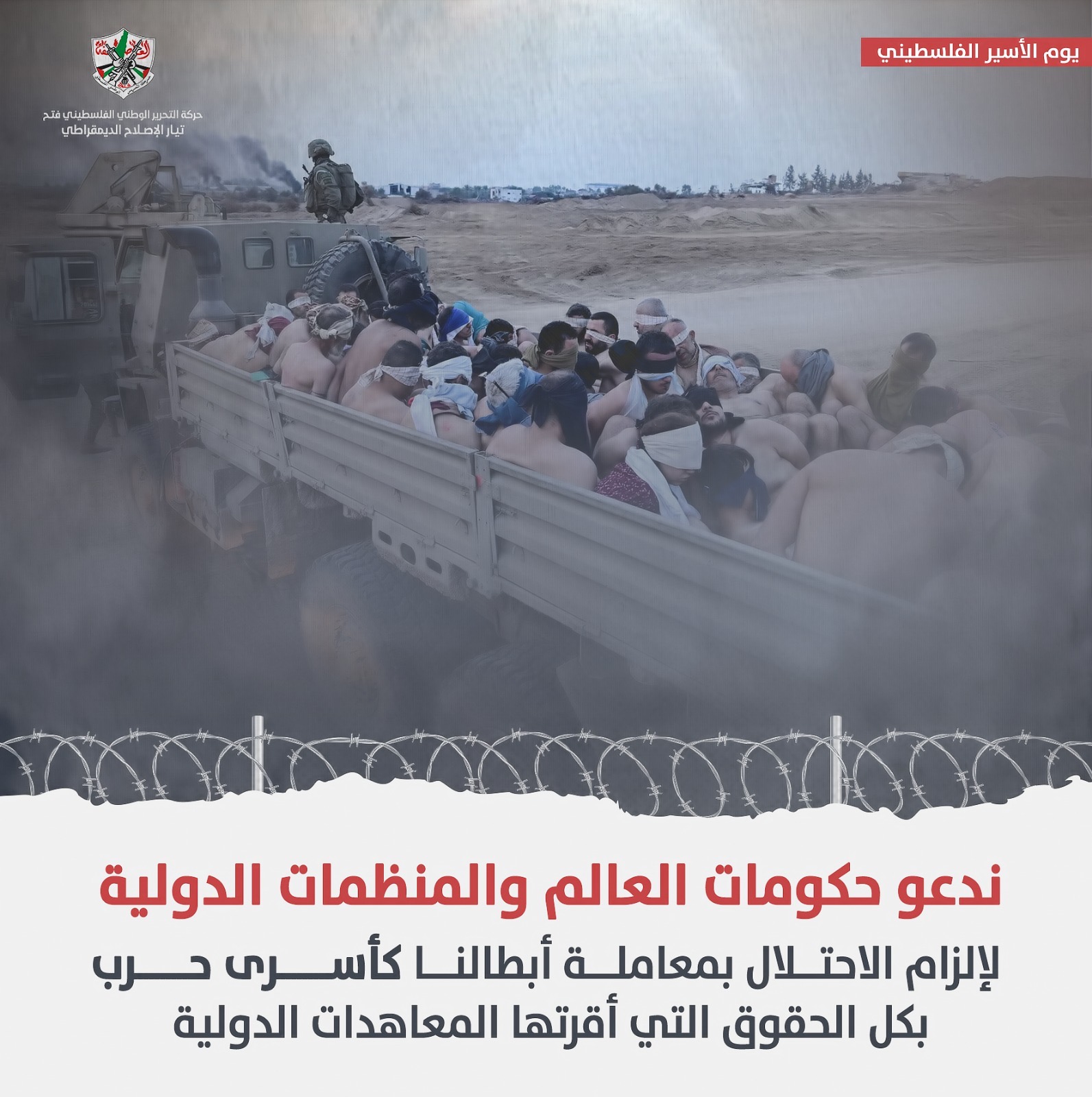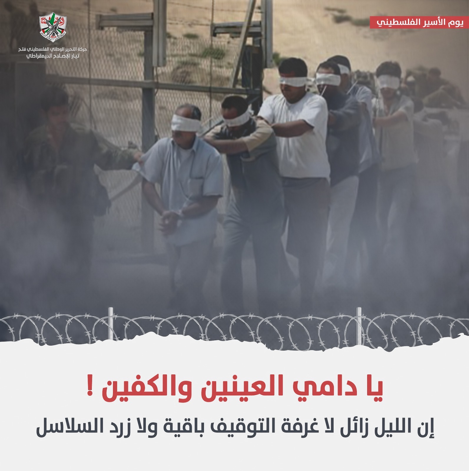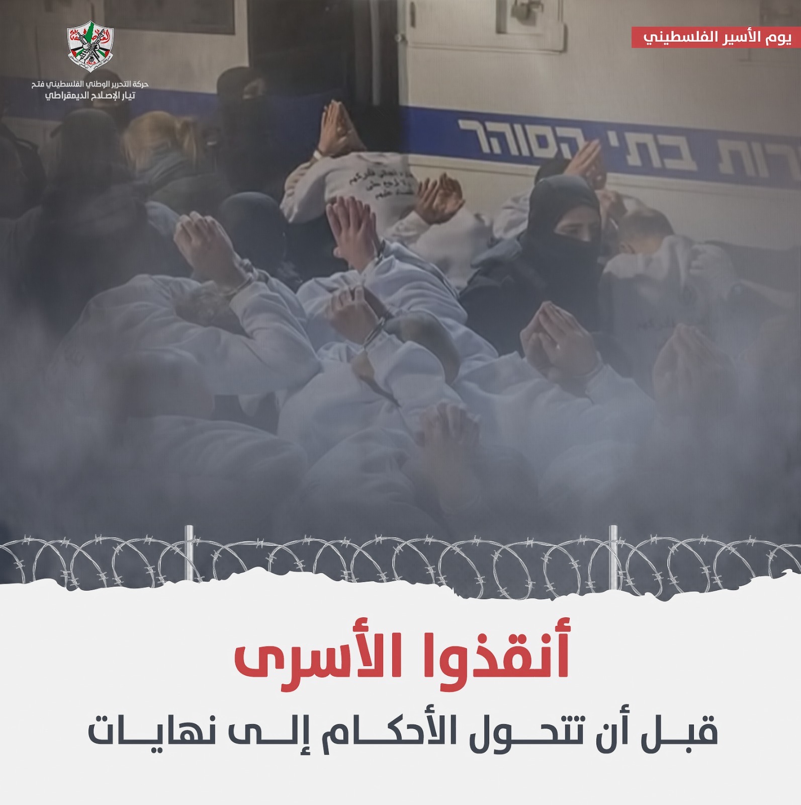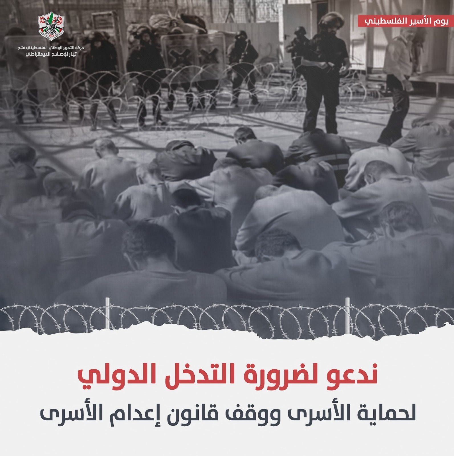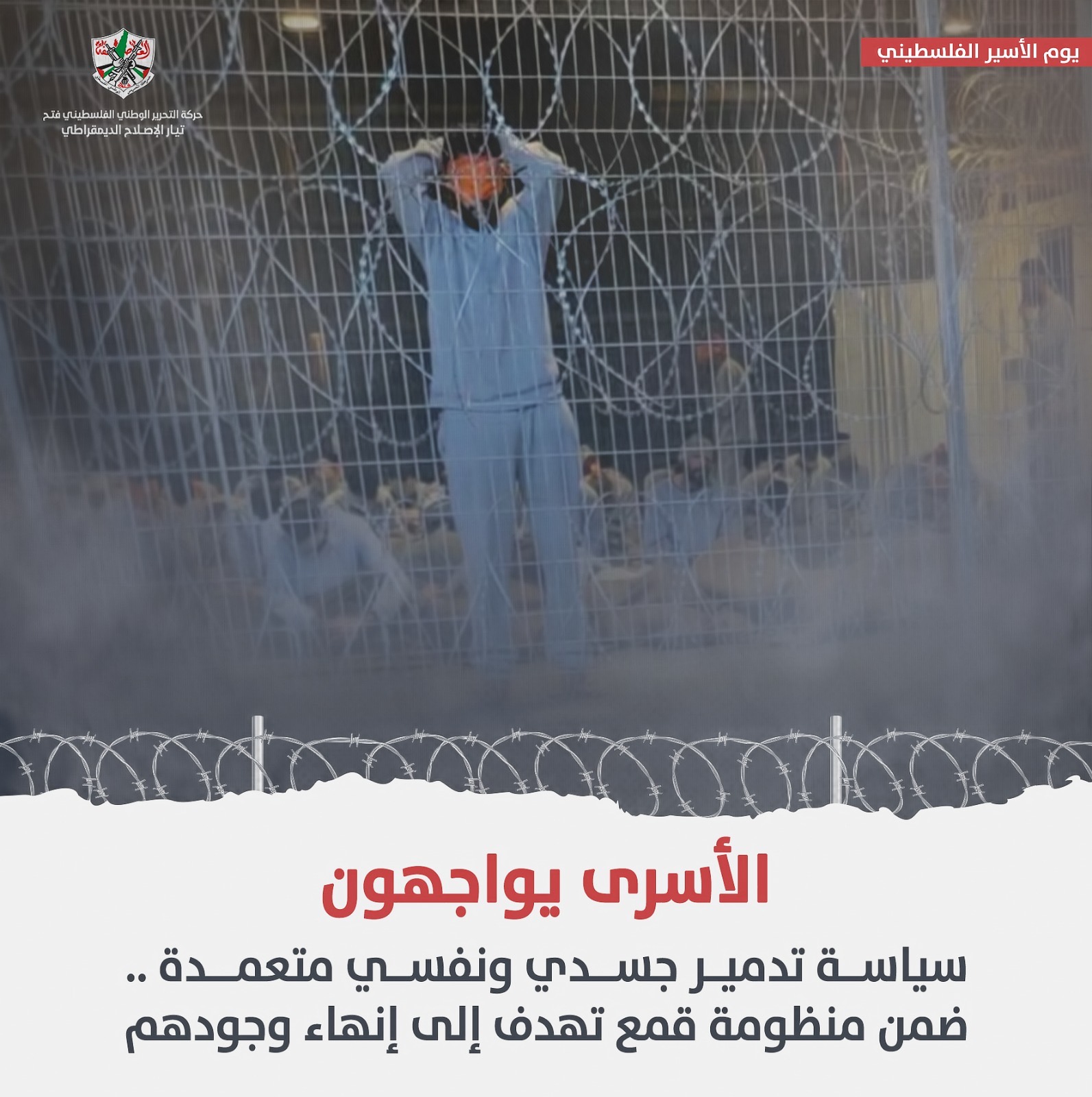 وأكد التيار على أهمية التفاعل الواسع عبر منصات التواصل الاجتماعي، من خلال نشر المحتوى والتغريد على هاشتاق #يوم_الأسير_الفلسطيني، بهدف تعزيز الحضور الإعلامي لقضية الأسرى، ونقل معاناتهم إلى الرأي العام، في ظل ما يتعرضون له من ظروف قاسية داخل المعتقلات.