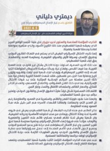 وأضاف دلياني، نذكر العالم، في هذه الذكرى البَشعة، أن شعبنا الفلسطيني يعيش في ظروف قاسية تحت وطأة الاحتلال، ويعاني من سلب لحقوقه الأساسية وحرياته الطبيعية، وأن شعبنا يعيش تحت نظام قمعي عسكري قائم على التمييز والعنصرية والإرهاب. مؤكداً على ضرورة إنهاء الاحتلال الإسرائيلي وحتمية ممارسة شعبنا لحق تقرير المصير، وان تيار الاصلاح الديمقراطي في حركة فتح يدعو المجتمع الدولي وجميع الدول الأعضاء في الأمم المتحدة إلى تحمل مسؤولياتها في حماية حقوق الإنسان والقانون الدولي، وفرض العقوبات اللازمة على دولة الاحتلال الإسرائيلي لوقف جرائمها وانتهاكاتها المستمرة. كما نجدد في هذه الذكرى المؤلمة، التزامنا الثابت بقضية شعبنا الفلسطيني، ونتعهد بمواصلة الكفاح لإنهاء الاحتلال الإسرائيلي وتحقيق العدالة لشعبنا.